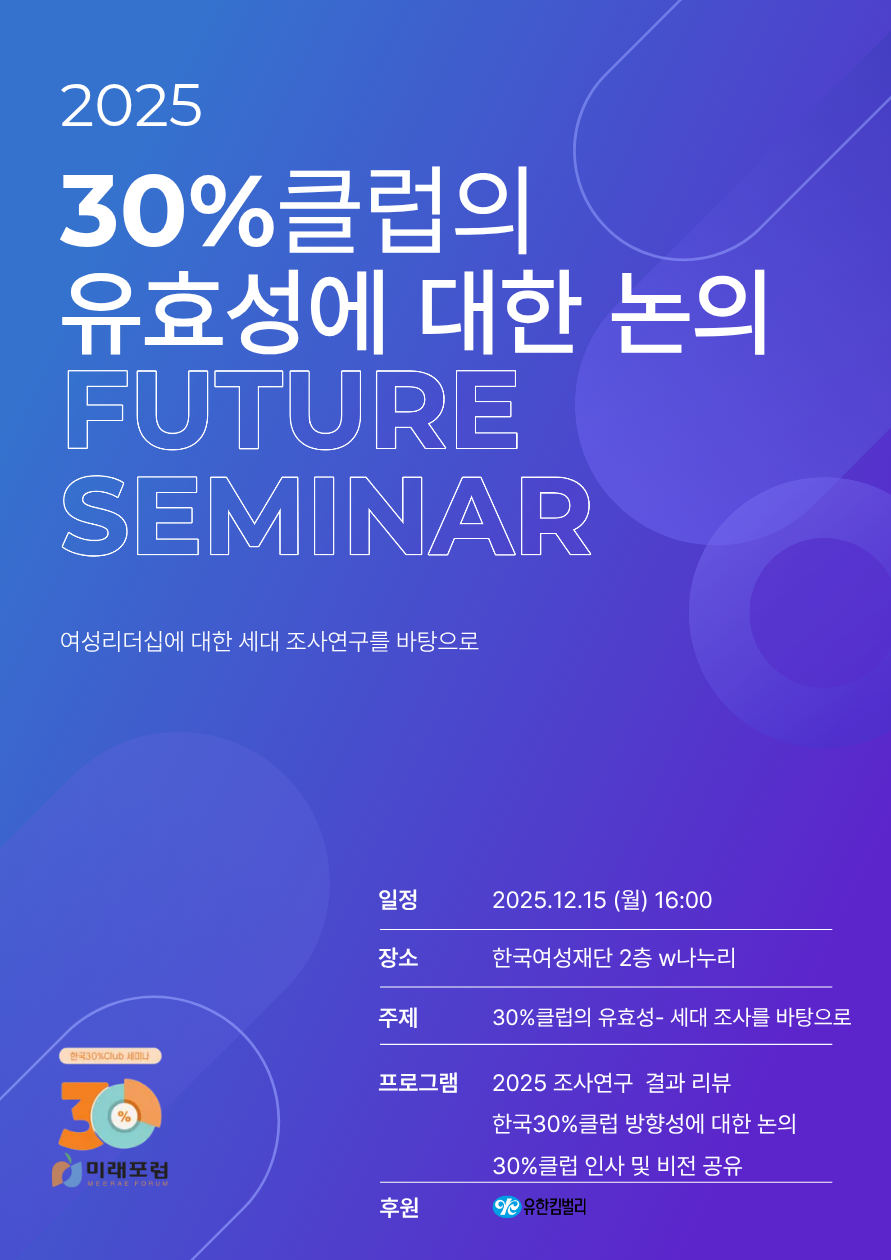 30%클럽캠페인 한국30%클럽 세미나 개최 일시 2025년 12월 16일 16:00 장소 한국여성재단 2층 W나누리 서울시 마포구 월드컵북로5길 13(서교동) 한국여성재단 신청기간 : 2025.11.30 ~ 2025.12.16 프로그램 교통안내