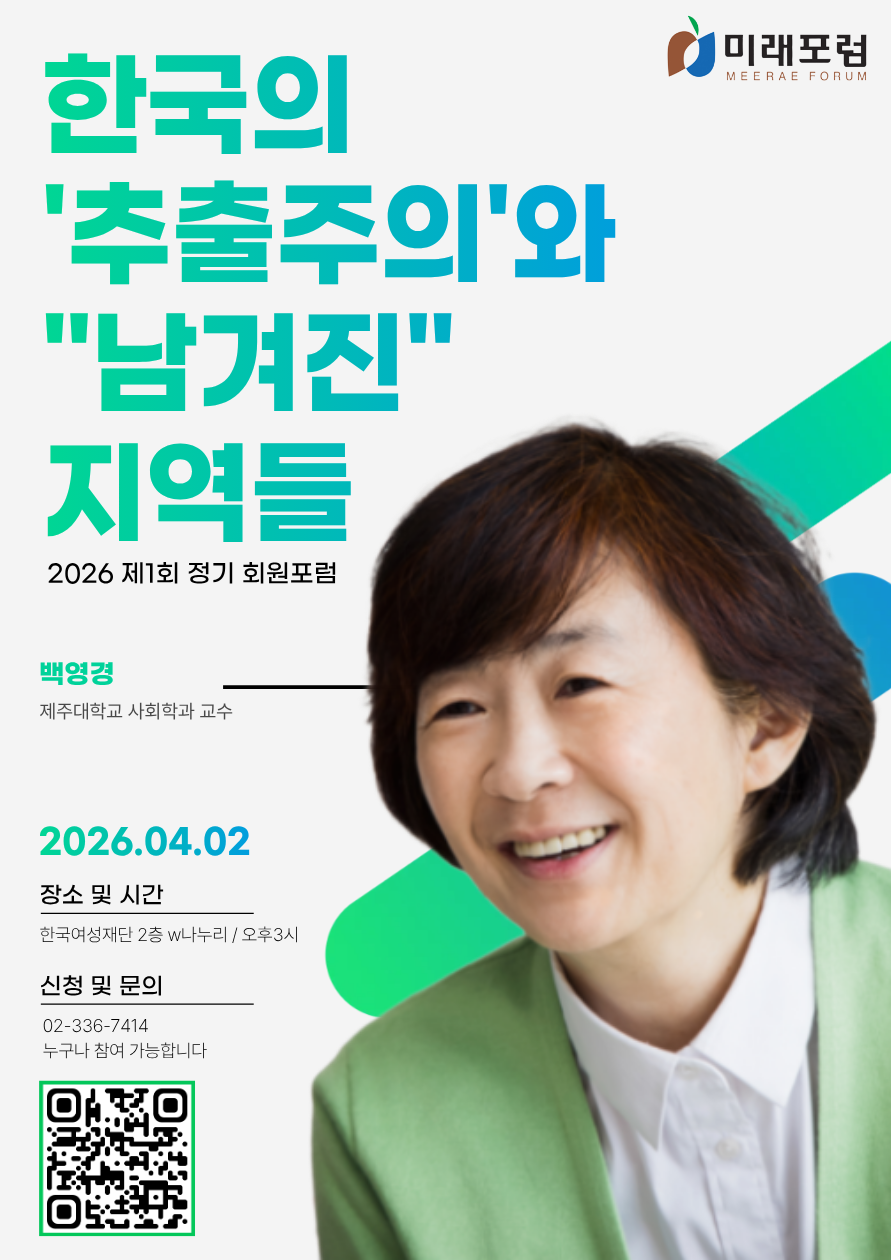 회원포럼 2026 제1회 포럼_ 한국의 ‘추출주의’와 “남겨진” 지역들 일시 2026년 04월 02일 15:00 장소 한국여성재단 2층 W나누리 마포구 월드컵북로 5길 13 신청기간 : 2026.03.13 ~ 2026.04.02 모시는글 프로그램 참여신청!! 이곳을 클릭해주세요.